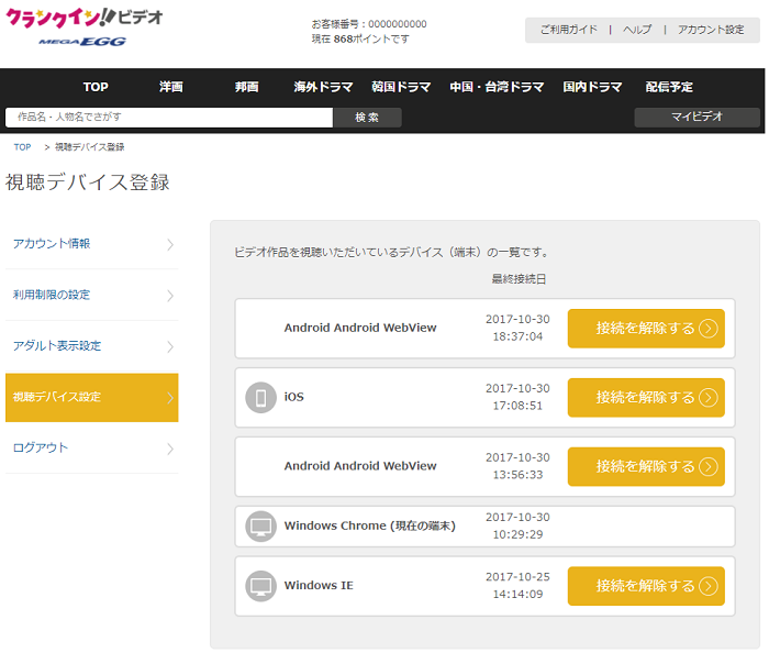 以下よりクランクイン!ビデオにログインいただき、「アカウント設定」の「視聴デバイス設定」より解除する端末の「接続を解除する」をクリックしてください。