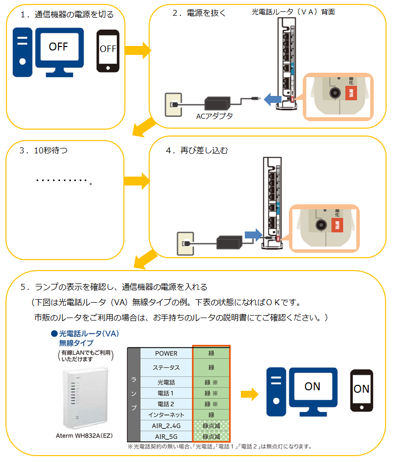 ①ルータと子機(パソコンやタブレット端末などの通信機器)の電源の入れ直し(再起動)をする。