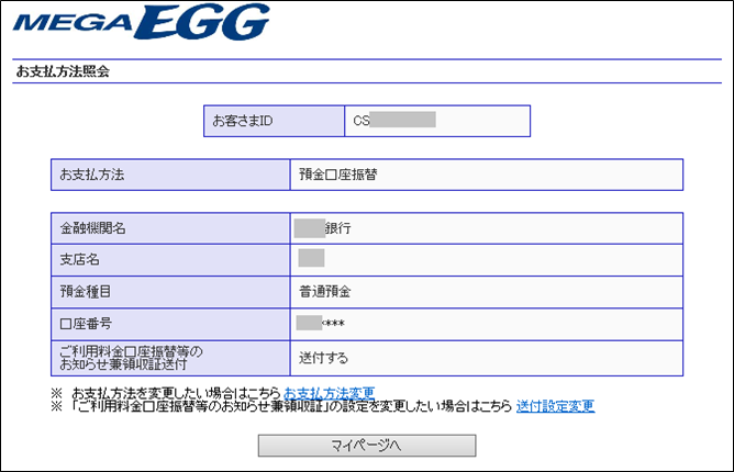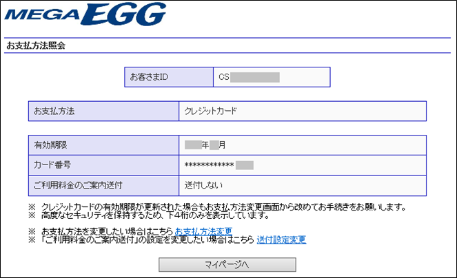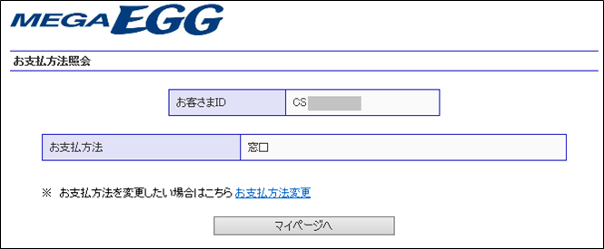 メガ・エッグ マイページへログインすることで、お支払い方法や、どの口座/カードなのかご確認いただけます。以下の図のとおりお進みください。